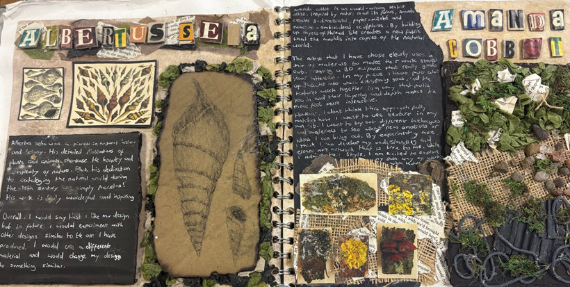 Year 10 students have completed a detailed study of natural forms, focusing on structure, texture, and fine detail. Their final pieces are the result of careful observational drawing, mark-making, and experimenting with various media. Inspired by artists such as Sarah Simblett and Amanda Cobbett, pupils explored how natural objects can inspire both realistic and abstract responses. Their studies of shells, leaves, fruit, and bones—created using clay, paint, and mixed media—demonstrate a thoughtful understanding of composition, tone, and layering. These works highlight their growing independence and ambition within the GCSE course.