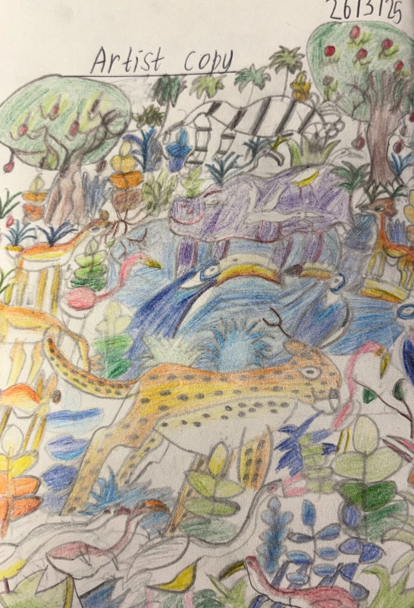 Year 7 students have been studying the vibrant work of Roger Djiguemdé, using his art to explore culture and identity. By looking closely at his use of bold patterns, striking colour combinations, and symbolic storytelling, pupils have gained a stronger appreciation for how art reflects heritage. They compared Djiguemdé’s style with their own cultural experiences to create mixed-media pieces that express both individuality and global understanding.